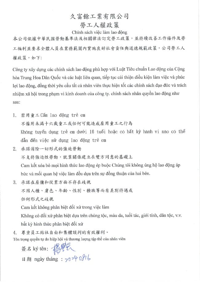 久富餘工業有限公司勞工人權政策